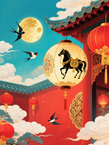 国潮插画风,拟人童趣与鎏金马匹相映,剪纸元素点缀,红金配色尽显中式喜庆,烟花灯笼烘托新春氛围。