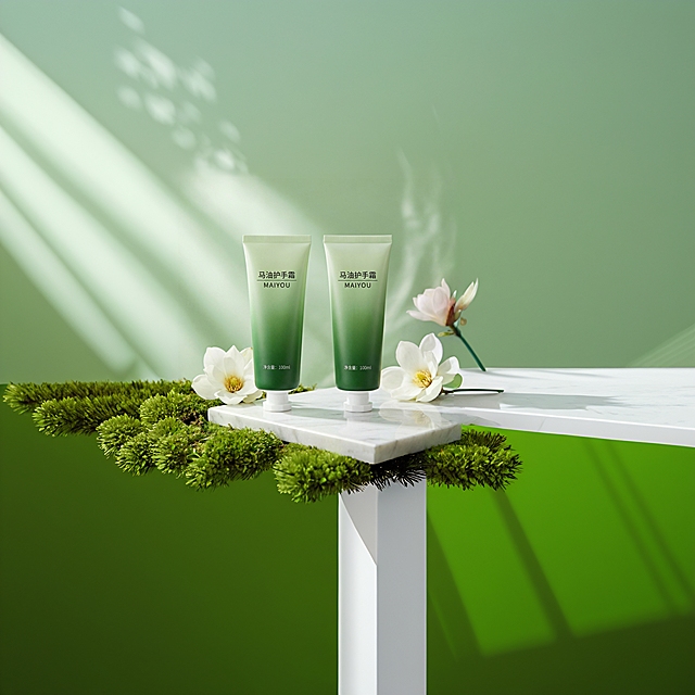 护手霜产品自然融入自然场景,画面正中央直立放置产品,产品放置在一块质感粗糙的深色岩石上,岩石表面覆盖着鲜活翠绿的青苔,岩石周围布置着盛开的纯白色栀子花、绿色蕨类植物和圆润绿叶,背景是干净柔和的浅绿色渐变,前景绿叶和花苞轻微虚化,背景柔焦,整体氛围自然清新。保持产品原有Logo和文字原样不变,保持产品主体物理结构不变,商业高调摄影,柔和漫射光,前中后景层次,三分法视觉重心,超细节,光线追踪,逼真材质表现,瓶身通透。负面提示:瓶身扭曲,文字错误,Logo变形详情