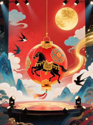 主体是黑金渐变球形宫灯(灯面上绘制披挂鎏金华丽鞍具的黑色奔马图腾和宝相花纹,奔马呈昂首嘶鸣姿态),宫灯光芒呈脉动式闪烁。背景为正红底 + 金色满月,古城楼剪影与飞燕点缀其间,色调以红、金、青蓝为主,整体呈现庄重而华丽的新年氛围。