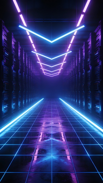 深蓝色调的赛博朋克风格3D科技背景,画面中央是由发光线条构成的复杂电路板纹理地面,地面中央有明亮的蓝色光效,垂直向上延伸出密集的、带有发光节点的科技感线条结构,线条呈现出对称的几何排列,整体光影效果具有强烈的纵深感和未来感,光源从底部向上渐变,营造出神秘而宏大的科技空间氛围,没有任何文字和标识元素。