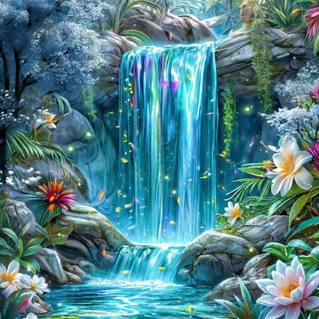 梦幻光影交织的瀑布秘境,水彩风与粒子光效融合,营造清透浪漫的虚拟自然画卷,静谧唯美的插画风格。