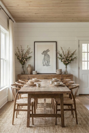 明亮通透的现代简约风格餐厅内部场景,以白色和浅木色为主色调,自然光透过大面积落地窗洒入室内,天花板悬挂着线条简洁的几何形白色吊灯,中央区域摆放着铺有浅色亚麻桌布的圆形餐桌,搭配浅灰色布艺餐椅,餐桌中央点缀着小型绿植花艺,靠墙设置悬浮式浅木色餐边柜,陈列着精致的玻璃器皿,角落处放置一个造型简约的藤编花瓶,插有几支白色和浅粉色的长茎鲜花,地面铺设浅色木地板,整体空间干净整洁、温馨舒适,充满自然清新的气息。