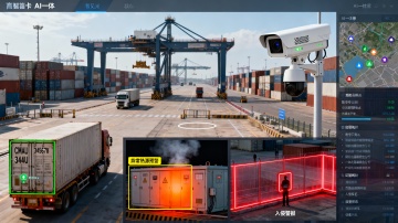 画面的核心是现实场景与智能系统的无感融合:从三个不同角度的摄像头延伸出半透明的浅蓝色扇形监测区域,这些区域在货轮中部的甲板位置相互重叠覆盖,构成一张无形的智能感知网络。在被重点覆盖的集装箱堆放区边缘,一缕刚刚升起的灰色初期烟雾(而非明显火焰)被精准捕捉,所在区域的监测扇形呈现轻微的脉冲光效,暗示异常已被锁定。