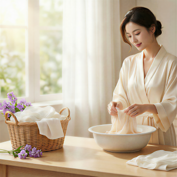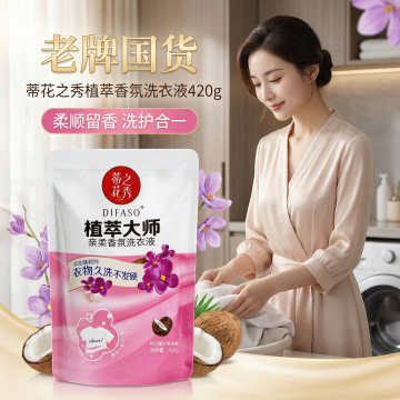 我是网店卖家,产品是我是网店卖家,产品是老品牌国货,蒂花之秀驰名商品袋装洗衣液,洗衣洁净,香味持久,根据你的经验帮我生成一个电商主图,提升一些洗衣液主体质感,切记不要出现网络违禁词,略微提升质感包装袋生成的包装主体不能改变,背景可以更换更适合产品的/一位美丽少妇正在洗衣粉的高级背景,/图片分辨率大小保持在800*800的像素不变/图片大小不变/根据产品主推特点结合网络热销词汇生成主图产品标题