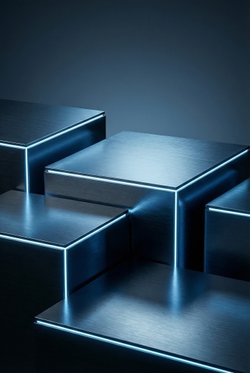 赛博科技风格的几何背景,由大小不一、角度各异的蓝色渐变方块构成,方块边缘锐利清晰,部分方块内部有细密的平行线条纹理,整体色调从浅蓝到深蓝自然过渡,呈现出平滑的数字艺术质感,营造出科技感与未来感兼具的氛围,构图以不规则的几何图形交错排列,形成富有动感的视觉层次。
