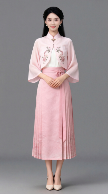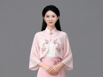 正面照,黑色古风垂挂髻,穿戴学士服学士帽,戴淡粉色刺绣云肩,学士帽旁边簪了粉蓝色的花,背景浅色,暖光