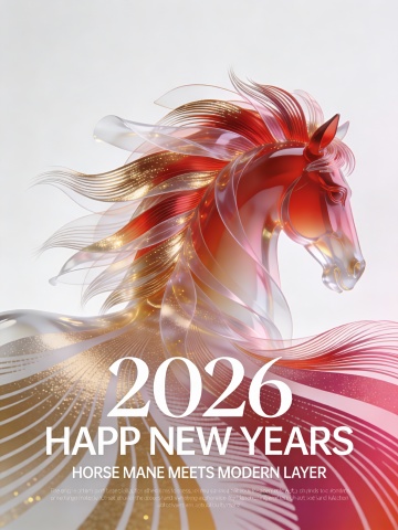 未来感与梦幻交织,3D玻璃风骏马头像,鎏金粒子流动,清透奢华,虚拟自然中演绎时尚优雅的2026新年视觉。