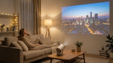 一个现代简约风格的客厅场景,阳光透过巨大的落地窗洒入,木地板泛着温暖的光泽,浅灰色的布艺单人沙发搭配黑色皮质脚凳,原木色的电视柜上放置着一台超薄智能电视,电视屏幕上显示着一个宁静的湖泊日落景色,湖面上有一艘小船,远处是连绵的山峦和橙红色的晚霞,天空中飘着几朵云彩,电视下方的应用图标清晰可见,电视柜上摆放着两个简约的黑色陶瓷花瓶,窗外可以看到城市的远景和山脉轮廓,整体氛围明亮、通透、舒适,具有高度的真实感和细腻的光影表现,光线从画面右侧窗户射入,在地面和家具上形成柔和的阴影和高光,色彩以原木色、灰色、白色为主调,搭配屏幕上日落的暖色调,构成和谐统一的现代家居美感。