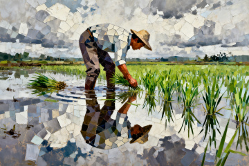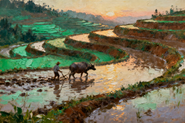 晨曦中的梯田,光影交错,雾霭缭绕,融合中式意境与厚涂风质感,呈现静谧而朦胧的虚拟自然画卷。