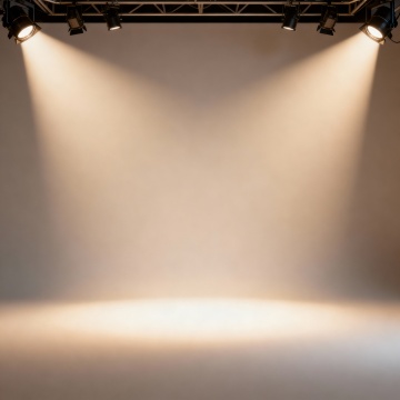 3D渲染风格的射灯光束,纯黑背景上,明亮的白色聚光灯光束从顶部中央呈锥形向下照射,光线边缘柔和渐变,内部有细微的光线层次感,底部在地面形成圆形光斑,整体光影对比强烈,营造出聚焦、专业、戏剧化的氛围,光线质感通透且具有立体感。