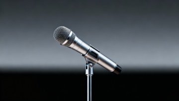 舞台设计,具有未来感和科技感的音乐表演舞台,舞台中央有黑色麦克风支架和麦克风,舞台地面由紫色发光方块地砖铺成,反射出明亮光泽,舞台背景是带有网格图案的深紫色墙面,两侧矗立着巨大的白色音响设备,音响上有圆形扬声器图案,舞台后方有蓝色透光玻璃窗,窗内隐约可见三个人影剪影,整体空间采用紫色和蓝色为主色调,搭配深色网格元素,灯光从上方投射出聚焦光束,营造出夜晚音乐演出的动感与神秘氛围,具有动漫风格的光影效果和清晰的线条轮廓,舞台两侧有对称的灯光装置,地面反光强烈,整体设计呈现出时尚、现代的视觉美感。