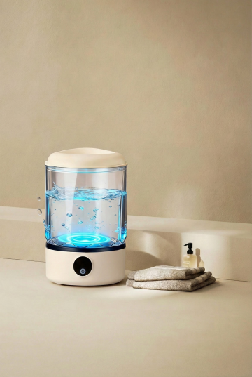 清新自然的浴室场景,融合木雕风与玻璃风材质,简约主义设计中透出柔和质朴感,性冷淡风色调营造舒适氛围,轻拟物风格提升实景感。