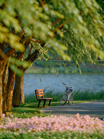 清新自然的湖畔场景,柔和光影洒落,柳枝轻拂,木椅与单车静置,粉色花海铺展,营造出唯美文艺的静谧氛围,实景感十足。