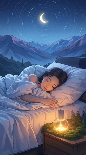 温馨的动漫风插画,简约主义设计,少女在床上享受舒适时光,窗外城市景色映衬。