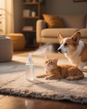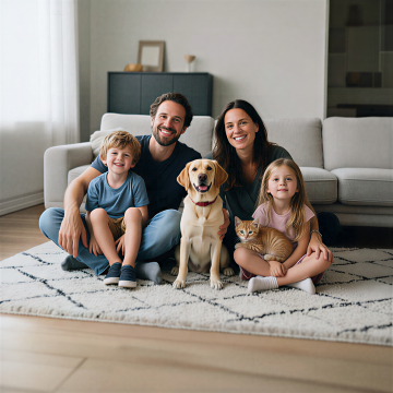 在深夜里,温暖的室内客厅场景,一只狗与一只猫依偎躺在地毯上,亲密自然互动,低机位拍摄,前景虚化,浅景深,背景沙发轻微虚化,午后自然光从侧窗洒入,柔和暖色调,真实家庭生活氛围,电影级光影,柔软阴影,高级商业摄影质感,超真实细节,毛发质感清晰,空间层次感强,色彩克制但温润,高级生活方式广告视觉