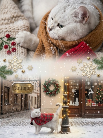 复古圣诞街景,拟人猫咪披红格围巾,暖光灯串与雪花点缀,拼贴风融合油画质感,营造温馨喜庆梦幻氛围。