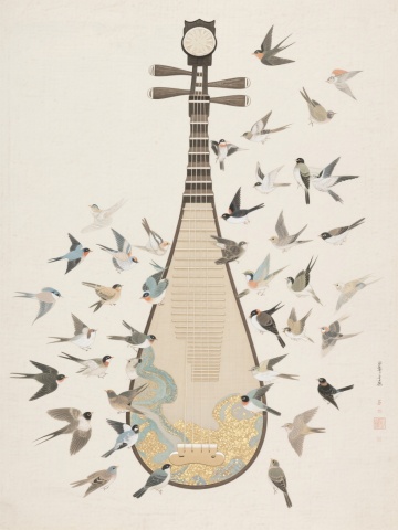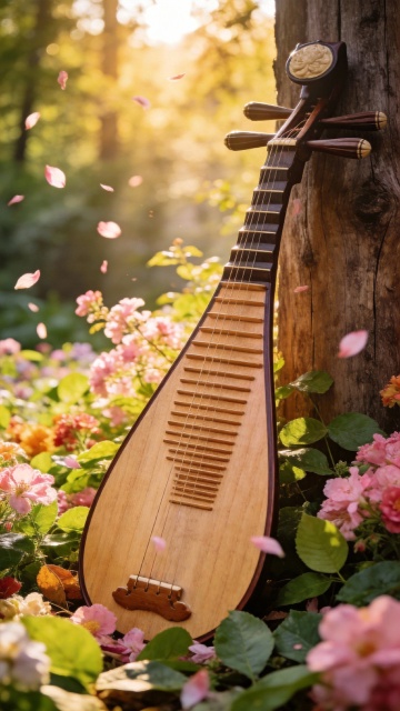 中式感琵琶倚树而立,花影婆娑,光影流转,唯美感与文艺感交织,3D风细腻呈现,静谧中透出浪漫气息。