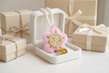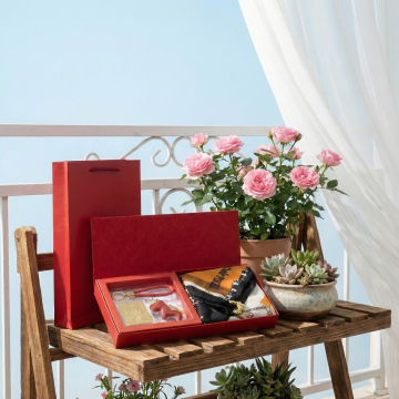 浪漫复古的商业摄影风格,画面采用粉绿撞色的柔和复古色调,以俯视中景视角、散落式的温馨陈列构图呈现,视觉重心聚焦于纸质礼盒内的主体(主体占比25%)。