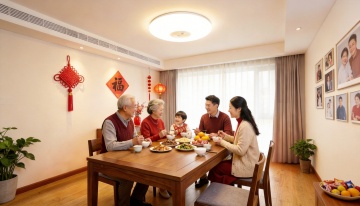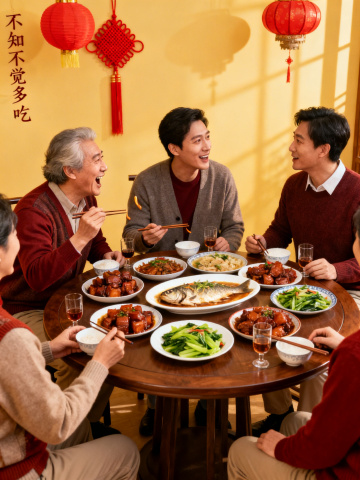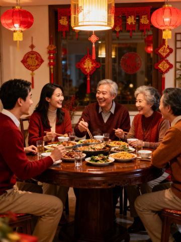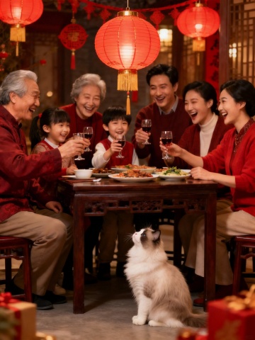国潮风与重拟物结合,中式庭院实景中,全家围坐圆桌共庆新春,红金刺绣服饰映衬喜庆氛围,油画质感呈现温暖团圆时刻。