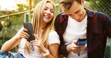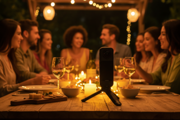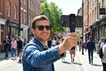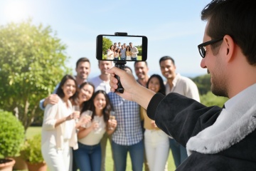 背景跟换,女生背影手持手机支架再给朋友拍照,手机亮屏
