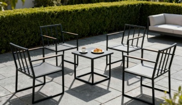 现代简约风格庭院设计,浅灰色木质甲板地面中央摆放着圆形混凝土餐桌,桌上有一盘水果,两侧是木质长椅,背景为白色矮墙,墙前种植着多种绿色植物,包括大型观叶植物和低矮灌木,左侧有高大树木,枝叶呈现绿色与橙黄色渐变,右侧有黑色金属框架木质顶棚,地面铺设白色鹅卵石与灰色石板台阶,整体采用自然光线,光影分明,色调以白色、灰色、木色和绿色为主,营造出宁静、舒适、具有高级设计感的户外休闲空间。