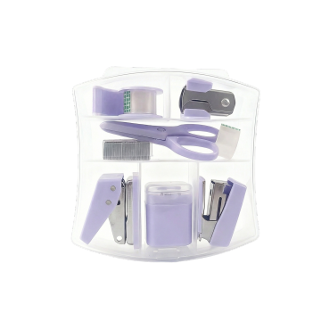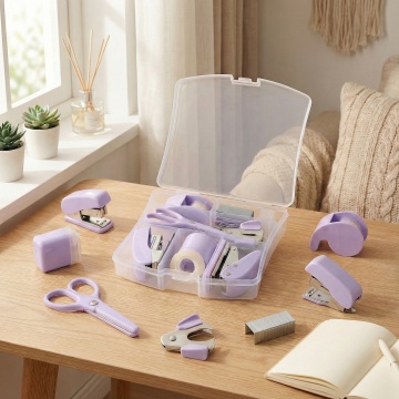 一组6个不同办公用具的3D图标,保持半透明磨砂亚克力质感,柔和渐变色彩,轻微内阴影和高光,统一白色纯色背景,规整网格排布。包含:1. 蓝色渐变透明文件夹,2. 绿色渐变透明笔记本,3. 紫色渐变透明订书机,4. 粉色渐变透明胶带座,5. 橙色渐变透明笔筒,6. 黄色渐变透明回形针盒,每个图标均保持相同的简约3D风格和光影处理,整体色彩明快清新,形成协调统一的办公文具系列素材集合。
