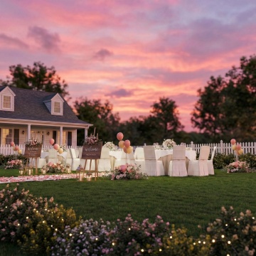 生成背景 在一个傍晚的草坪的院子上 旁边都是温暖的黄色氛围灯 还有精美的座椅 上面有不少实物