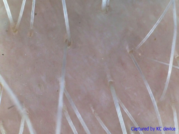 高度写实的3D医学解剖插画,皮肤多层结构的立体剖面展示,顶层有三根粗壮、乌黑、表面光滑的毛发从毛囊中长出,毛囊根部附着红色颗粒状物质,中层可见排列整齐的粉色圆形细胞结构,底层是黄色蜂窝状组织,其间分布着红色管状结构并向外渗透粉色微粒,整体色调以肉粉色、淡黄色、红色为主,光影柔和,立体感强,细节清晰,具有科学严谨的医学可视化风格,突出皮肤各层组织的微观结构和相互关系。