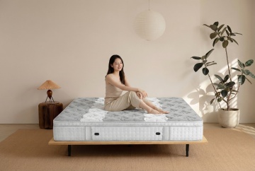 一张温馨的卧室场景,中央是一张铺着棕色床垫的床,床垫表面柔软舒适,带有自然的纹理。阳光透过窗户洒在床垫上,形成温暖的光斑。床头柜上摆放着一盏柔和的台灯和一盆绿色植物,整体色调温暖柔和,营造出舒适、放松的居家氛围。