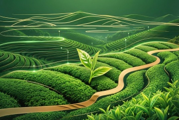 一幅充满生机的插画风格稻田风景,画面以近处饱满金黄的稻穗和翠绿的稻叶为前景,稻穗低垂饱满,稻叶修长舒展,细节丰富。中景是层层叠叠、线条优美的绿色梯田,向远方延伸直至天际线,梯田边缘有零星树木点缀。远景是广阔的天空,呈现从地平线处温暖的橙黄色渐变到上方明亮的蓝绿色,天空中漂浮着形态柔和、边缘朦胧的白色和淡蓝色云朵,几片绿色的叶子轻盈地随风飘散在空中,营造出宁静、清新、充满希望的田园氛围,整体色彩明快和谐,光影柔和,具有鲜明的动画插画质感。