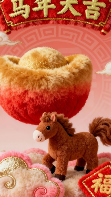 软3D风格萌马坐于刺绣风“发财”钱袋中,搭配金元宝、红包与鞭炮,喜庆卡通感十足,传递2026丙午年新春吉祥财运。