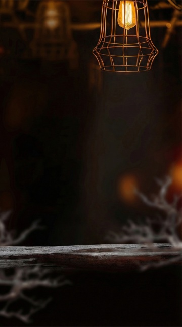 超写实摄影风格,深色背景,暖色调低光照环境,柔和的橙黄色灯泡悬挂于金属支架上,灯光在粗糙的石墙和木质桌面上投下温暖的光斑与长阴影,前景为纹理清晰的深色木质桌面,背景模糊营造出神秘而宁静的氛围,整体画面具有电影感的景深效果和细腻的材质表现。