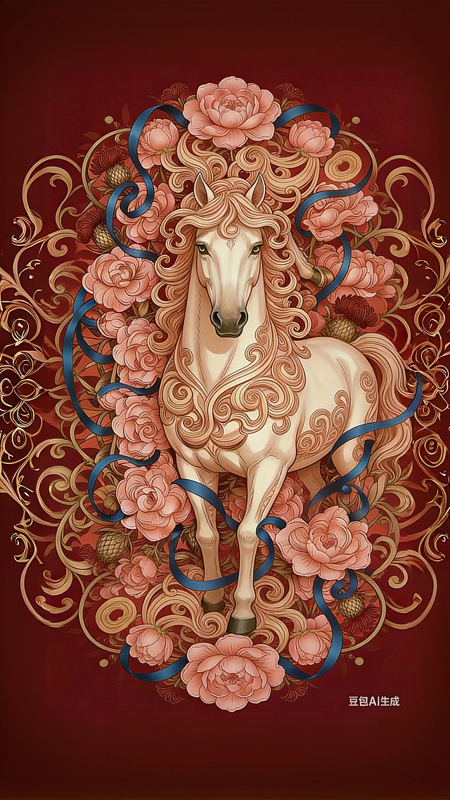 鎏金浮雕风白骏马,配以华丽珠饰与祥云花卉,红金背景尽显中式奢华与喜庆,国潮插画风中透出古典优雅之美。详情