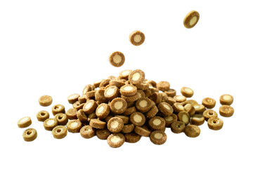 场景变为为俯拍,图中托盘变为白色瓷碗,盘子里的饲料颜色大小不变,呈溢出状态