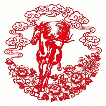 红色剪纸风骏马图,融合民族与国潮元素,单色设计凸显中式喜庆感,祥云环绕,寓意吉祥如意。