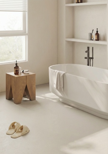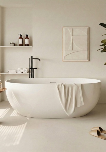极简主义风格的卫生间室内设计,整体采用米白色与浅木色的柔和配色方案,温暖的嵌入式灯带与顶部筒灯提供均匀柔和的照明,营造明亮通透的氛围。墙面和地面铺设大块浅色哑光瓷砖,线条简洁流畅。不同场景下的卫生间摆设:有的配备悬挂式白色洗手台,台面整洁,搭配简约白色水龙头,上方是带储物功能的镜柜,旁边装有黑色金属毛巾架;有的设置独立玻璃淋浴房,内部有壁龛收纳洗浴用品,黑色淋浴喷头与五金件形成精致对比;有的墙面悬挂线条简约的黑白花卉装饰画,下方嵌入木质灯带壁龛,摆放香薰和装饰摆件;有的空间内放置智能马桶,旁边设有带木质搁板的收纳区。整体设计注重功能性与美学的平衡,空间布局合理,细节处理精致,呈现出现代、干净、舒适的卫生间环境。