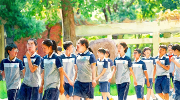 全景俯拍视角,在一座被晨光温柔唤醒的百年老校舍三楼走廊尽头,一间微微敞开着木门的教室正悄然诉说着时光故事——褪色的墨绿色黑板上用白色粉笔写着数学公式和几句潦草的励志格言,黑板边缘还挂着泛黄的世界地图,阳光透过爬满常春藤的玻璃窗,在地面切割出菱形光斑,光斑中漂浮着细小的尘埃。二十张核桃木课桌呈整齐的四列排列,每张桌面上都有深浅不一的刻痕,其中一张靠窗的课桌上,压着半块橡皮、翻开的语文课本(第三十七页的《从百草园到三味书屋》被阳光照亮),以及用玻璃瓶装着的野雏菊。教室后方的黑板报上用彩色粉笔绘制着"新学期新希望"的主题画,角落的饮水机旁堆着几个空水桶,墙角的老式吊扇正缓慢转动,在天花板上投下旋转的阴影,空气中弥漫着粉笔灰、旧书本和淡淡消毒水混合的味道,色调以温暖的赭石色木质纹理为基底,点缀着苔藓绿黑板与天蓝色窗帘的清新对比。