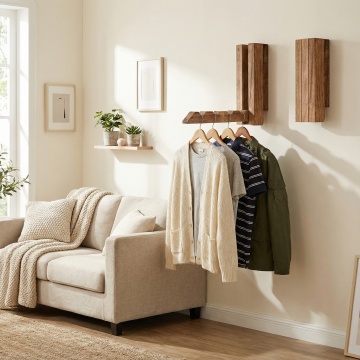 用这个衣架去生成一组日用场景图 主图内容:衣架(保留 “TAILI 太力” 品牌标识),挂在白色衣柜挂杆上,周围搭配多件浅色系衣物(含白色毛衣、米色衬衫、浅棕外套等) 场景设定:现代简约风格的白色衣柜内部,上层摆放折叠整齐的浅米色织物,挂杆区域衣物排列有序 风格参考:写实风家居产品展示图,质感清晰、细节真实 色彩色调:整体以浅色系(米白、浅黄、浅棕)为主,搭配白色柜体的干净底色,色调柔和清新 构图视角:平视角度,聚焦衣柜挂杆区域,衣架处于画面视觉中心