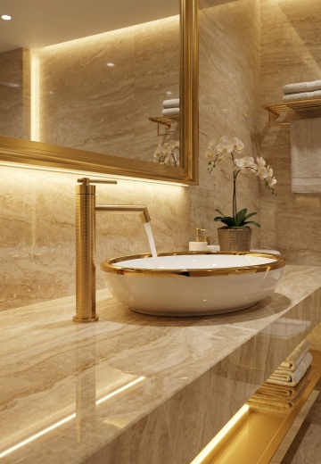 极简主义风格的卫生间室内设计,整体采用米白色与浅木色的柔和配色方案,温暖的嵌入式灯带与顶部筒灯提供均匀柔和的照明,营造明亮通透的氛围。墙面和地面铺设大块浅色哑光瓷砖,线条简洁流畅。不同场景下的卫生间摆设:有的配备悬挂式白色洗手台,台面整洁,搭配简约白色水龙头,上方是带储物功能的镜柜,旁边装有黑色金属毛巾架;有的设置独立玻璃淋浴房,内部有壁龛收纳洗浴用品,黑色淋浴喷头与五金件形成精致对比;有的墙面悬挂线条简约的黑白花卉装饰画,下方嵌入木质灯带壁龛,摆放香薰和装饰摆件;有的空间内放置智能马桶,旁边设有带木质搁板的收纳区。整体设计注重功能性与美学的平衡,空间布局合理,细节处理精致,呈现出现代、干净、舒适的卫生间环境。