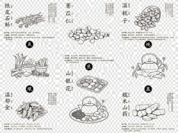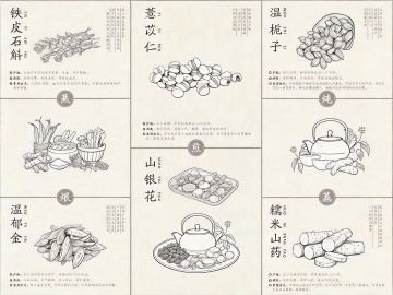 六个系列的中药元素集合,每个元素都采用复古手绘插画风格,以米色为纯色背景,包含以下不同内容:1. 左侧:一本打开的古旧草药书,书页上放着几支人参和灵芝,旁边散落着几颗黄色的药丸;右侧:一个棕色陶罐,里面插着几支干枯的艾草,罐口系着麻绳。2. 左侧:一个竹编簸箕,里面装满了晒干的金银花和菊花,旁边放着一个小铜秤;右侧:一张卷起来的草药图谱,用红绳系着,旁边散落着几片银杏叶。3. 左侧:一个青花瓷碗,碗里盛着当归和枸杞,旁边放着一把小银勺;右侧:一棵手绘的草药植株,根部带着泥土,叶片翠绿,旁边有几颗红色的果实。4. 左侧:一个木质药柜抽屉,抽屉上贴着“川芎”的标签,里面露出几支川芎根茎;右侧:一个玻璃药瓶,里面装着黑色的药膏,瓶口用软木塞封着,旁边放着一支小毛刷。5. 左侧:一张手绘的人体经络图,图上用红线标出穴位,旁边放着几根银针;右侧:一个小竹篮,里面装着薄荷和藿香,篮子把手处系着蓝色布条。6. 左侧:一个铜制药炉,炉口冒着热气,旁边放着一把蒲扇;右侧:一张写着草药配方的泛黄纸张,纸上放着几支甘草和黄芪,旁边散落着几颗褐色的种子。所有元素排布规整,线条细腻,色彩以棕色、绿色、红色为主,呈现出古朴自然的氛围,无任何文字、LOGO、电话地址及二维码。