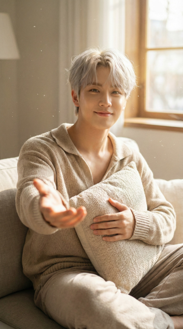 画面中是一位身着米色宽松针织毛衣的年轻男性,他坐在沙发上抱着抱枕,伸手向镜头,柔和的暖光与漂浮的尘埃营造出治愈浪漫的氛围