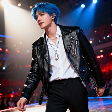 年轻男性歌手,五官精致,带有清冷感,黑棕色微卷短发,发丝蓬松有动感,部分发丝泛着光泽,身着宽松的白色衬衫,领口微开,袖口随意挽起,衬衫质感柔软且有自然褶皱,搭配黑色皮带,佩戴银色项链(带有吊坠),手持麦克风,握姿自然,背景是暖金色与蓝紫色交织的炫彩光效,大量运用炫光、反光效果,营造blingbling的舞台明星梦幻感,写实摄影风格