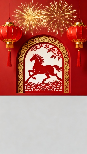 国潮风插画,剪纸窗格框景,工笔马跃山巅,水墨山水与鎏金祥云交织,红底喜庆,烟花点缀,尽显中式古典年味。
