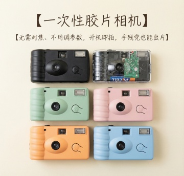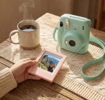 一个粉色渐变的instax mini 12拍立得相机,具有圆润的机身设计,正面有圆形的镜头和闪光灯,顶部有快门按钮和取景器,白色背景,3D渲染风格,高细节,光滑的塑料质感,柔和的光影效果,立体感强,简约时尚。