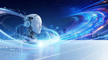 超写实3D渲染的科技感机器人,金属质感的黑色头部与银色躯干,蓝色发光眼睛与内部机械结构细节清晰可见,头部微微侧转,背景是深邃的蓝色渐变,布满流动的霓虹蓝色数据流线条与橙色、红色光点,左侧有巨大醒目的白色“AI”字样,整体光影效果强烈,高光与阴影对比鲜明,营造出未来感与科技氛围,画面聚焦机器人上半身,构图紧凑,充满视觉冲击力。