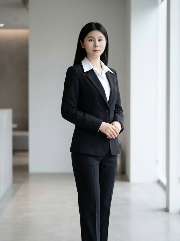 专业客服人员形象照,正面站立姿势,双手交叠于腹部,佩戴专业黑色头戴式耳机麦克风,身着黑色修身西装外套(单排双扣设计,左侧胸前口袋)与白色衬衫,黑色及膝西装裙,浅灰色纯色背景,柔和均匀的正面光源,清晰的面部光影过渡,自然微笑表情,职业干练的气质,高清商业人像摄影风格,锐利的细节,平滑的肤质处理,简洁大气的构图,人物居中且占据画面主要位置,展现专业、亲和、可信赖的客服形象。