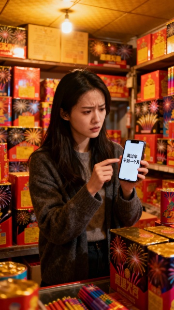 画面: 分屏展示。左侧:顾客在手机上浏览烟花、点击“预订”;右侧:店主在后台收到订单提示,准备货品。