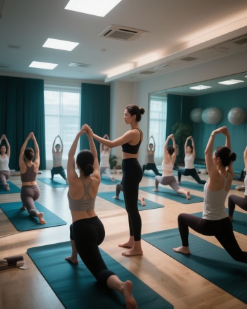 写实风格室内场景,明亮自然光从左侧窗户洒入,木质地板与浅灰色墙面形成温馨家居氛围,年轻女性扎着马尾辫,穿着白色背心和深灰色运动裤,正在做瑜伽鸽子式动作,身体侧俯,右腿弯曲膝盖着地,左腿向后伸直,双手撑地保持平衡,面带微笑,瑜伽垫上放着一台打开的笔记本电脑,背景有绿色植物、灰色布艺沙发和白色书架,整体色调柔和,光影过渡自然,画面构图采用三分法,人物位于中央偏右位置,营造出健康活力的居家运动场景。