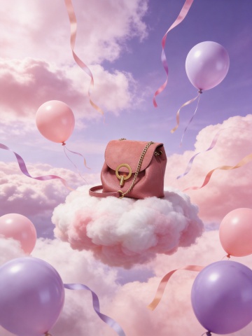 梦幻粉紫天空下,粉色云朵托起精致皮包,漂浮气球与丝带环绕,3D重拟物风呈现超现实浪漫场景,温柔甜蜜如童话梦境。