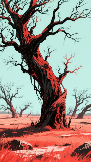 写实日漫,红黑色,树林,,红色的太阳,全景构图大气、燃,细节丰富,9:16,不要人物,生成2张